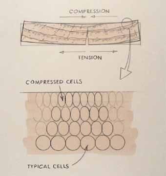 Compression shrinkage has been well understood by wood technologists for decades, but none of them carried it to its logical conclusion to explain warping until Carey Howlett did so in a paper he presented to the Wooden Artifacts Group of AIC (The American Institute for Conservation of Historic and Artistic Works) in 1995.You can read the paper at: http://aic.stanford.edu/sg/wag/1995/WAG_95_howlett.pdf.